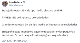 De la misma manera, podemos ver este argumento reflejado en el tweet que publicó en 2021 la entonces ministra de Derechos Sociales y secretaria general de PODEMOS, Ione Belarra: