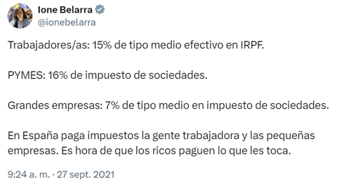 No obstante, la peor parte de su afirmación es el bulo de que las grandes empresas solo tributan al 3.8 %. Este dato no tiene absolutamente ningún fundamento, es un dato inventado o desconocido. Si acudimos al informe Declaración país por país de multinacionales con matriz española de 2019, podremos observar cómo las grandes empresas con sede española devengan un tipo efectivo del 18.42 %, una cifra que no tiene absolutamente nada que ver con la aportada por Yolanda Díaz.