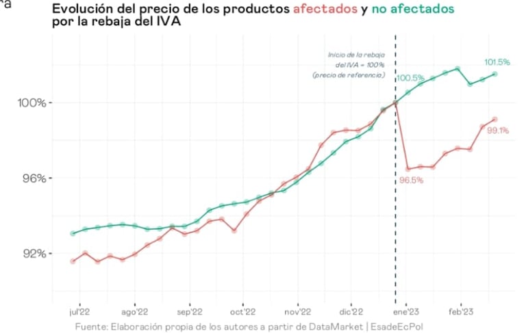 Este hecho ha generado numerosas críticas por parte de políticos y medios de comunicación, mochas de las cuales afirman que las grandes cadenas de supermercados no trasladaron la bajada del IVA a los precios de sus productos. Entre los políticos que han expresado estas críticas se encuentran Ione Belarra e Íñigo Errejón, quienes acusan a los supermercados de haber aprovechado la reducción del IVA para aumentar sus beneficios. Sin embargo, este argumento no se sostiene al analizar los datos. El Centro de Políticas Económicas EsadeEcPol evaluó el efecto de la reducción del IVA sobre los precios en las grandes superficies. El estudio se basó en el seguimiento de dos grupos de productos: los afectados por la bajada del IVA y otros productos similares que no lo estuvieron. El estudio muestra que ambos grupos de productos siguen una tendencia similar hasta que se produce una ruptura en el primer semestre de 2023, cuando empezó la rebaja fiscal. La investigación concluyó que el 90% de la rebaja del IVA fue efectivamente trasladada a los precios finales de los productos afectados.